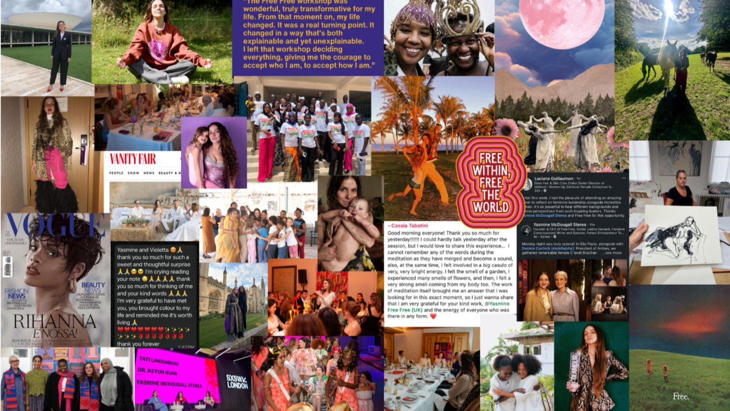 By thirty-five, she had transformed her grief into Free Free, a $70 million global movement of artists, leaders, and wildflowers advancing the freedom of women and girls. Her work has been recognised by Forbes, the United Nations, and Glamour. She has hosted gatherings alongside the World Economic Forum in Davos and spoken at South by Southwest.